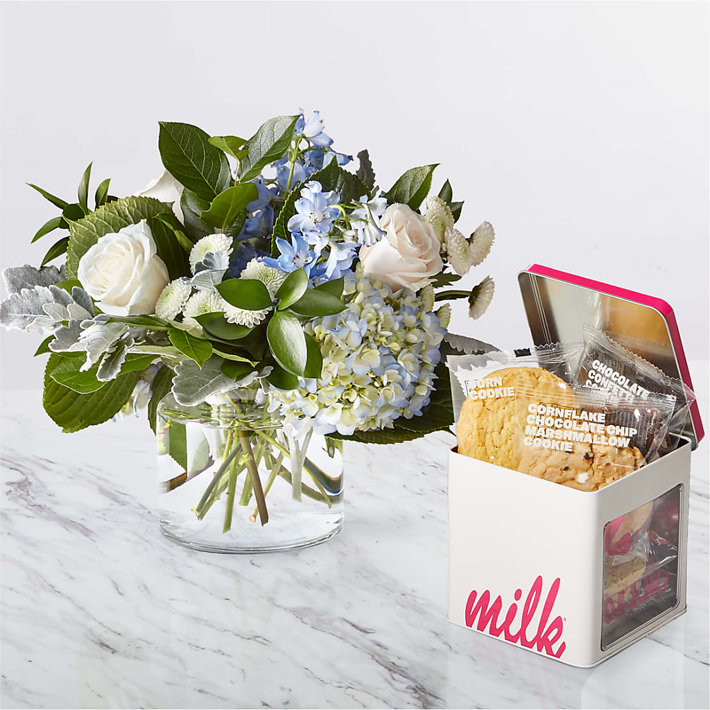 If their wish list reads: 'something fruity, corny chewy, crispy, fudgy, salty–sweet, and floral', then by do we have the perfect gift for you. Deliver a variety of Milk Bar's bestselling cookies with our fresh winter bouquet with signature blue hydrangea and ivory roses.